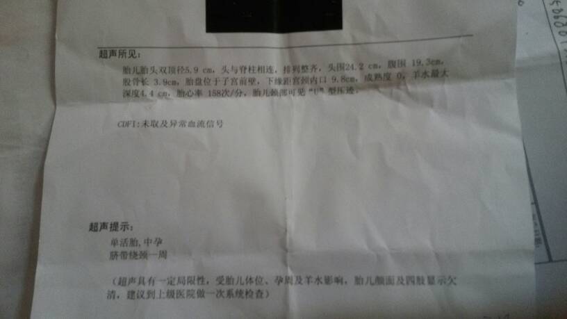 孕24周,帮忙看一下今天做的B超有问题没? 孕24周,帮忙看一下今天做的B超有问题没? 点击展开 风中叮咛 2014-07-07 18:24 为您推荐: 其他回答 没有什么问题,宝宝脐带绕颈是非常常见的,宝宝在子宫的活动空间相对较大,脐带随时可能绕回来,这个你不用担心 潇洒行走天涯 2014-07-07 22:02 相关问题 今天刚好孕5周,可以照B超? 孕十周昨天下面出血,去医院检查做B超没事,孕酮有点低,医生说让吃黄体酮,可今天又出血了,是怎么回事 上个月去做B超孕囊大小约5 0×2 1×4 4医生说大概有12周了!今天去做检查孕囊大小约8 8×