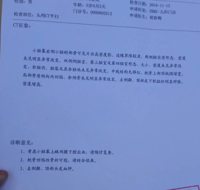 小脑幕上珠网膜下腔出血:小孩顺产,产程很长,有用工具辅助,出生三天,头偏大,目前留院观察,医生反应 小脑幕上珠网膜下腔出血:小孩顺产,产程很长,有用工具辅助,出生三天,头偏大,目前留院观察,医生反应头皮血肿,请达人帮忙看一份CT,确认是脑内出血还是脑外,情况是否危险,是否需要更多治疗,非常着急,跪谢! 点击展开 大米唐 2016-11-15 17:49 为您推荐: 其他回答 听听医生的 @娜娜宝妮@ 2016-11-16 19:28 不清楚,, 能猫。。。 2016-11-16 18:21 可以的,, lenglingdi,, 2016-11-16 16:54 具体听医生安排 188*****150_tvhb 2016-11-16 15:49 正常,,,,,,, 快乐,happy 2016-11-16 11:51 加载更多 相关问题 顺产珠网膜下腔出血现在十一个月,应该没事了吧 宝宝出生的时候体重偏大,顺产的时间太久了,所以导致孩子生出来窒息了,医生当时就给小孩打氧气,抢救 孕23+,四维检查出有副胎盘,医生说怕大出血不能顺产,请问是不是很严重,请问这个情况该怎么处理啊好