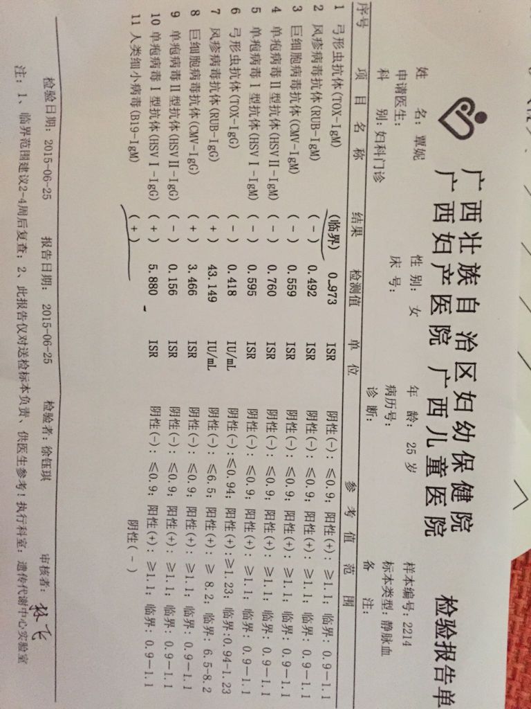 本人现25岁,这是做孕前检查的化验单,还未怀孕,麻烦专业人士能不能帮我看看这张化验单,看看有什么问 本人现25岁,这是做孕前检查的化验单,还未怀孕,麻烦专业人士能不能帮我看看这张化验单,看看有什么问题吗? 点击展开 匿名用户 2015-07-04 17:41 推荐回答 你好,在你的化验单上可以看出,你筛串的化验两个风浅怪吉诊一个高一个底毯昌,别的都是正常 匿名用户 2015-07-04 17:45 宝宝知道提示您:回答为网友贡献,仅供参考。 相关问题 怀孕两个月了,也就是8周 去医院进行了化验,化验单如下,希望专业人士帮我看看 医院医生说正常 今天去医院抽血化验单医生说我怀孕了,不敢相信啊,再帮我看看吧 医生你好,麻烦帮我看看化验单说HCG高,要紧吗?