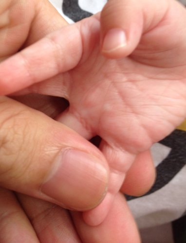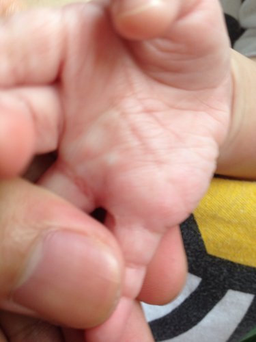 宝宝5个月,今天发现右手掌无名指处有一粒硬邦邦的东西,感觉像骨头,但是手正常活动,请问是什么原因 宝宝5个月,今天发现右手掌无名指处有一粒硬邦邦的东西,感觉像骨头,但是手正常活动,请问是什么原因,需要治疗嘛?如图,百点处! 点击展开 匿名用户 2014-08-04 09:56 为您推荐: 其他回答 最好去医院问骨科大夫 匿名用户 2014-08-04 21:27 手可以正常活动是没什么大问题,我姐的脚从小也长的一个硬邦邦的,都二十多年了,没事,如果亲不放心可以去儿童医院骨科咨询一下 匿名用户 2014-08-04 16:02 相关问题 宝宝马上八个月,前两天发现左手手掌无名指根部有骨头一样的凸起,可是宝宝也没什么反应,请问谁知道这是 新生儿有手掌,有假手指,骨头 想问能否医治?[手部缺陷] 新生儿有手掌,有假手指,骨头 想问能否医治?[手部缺陷]