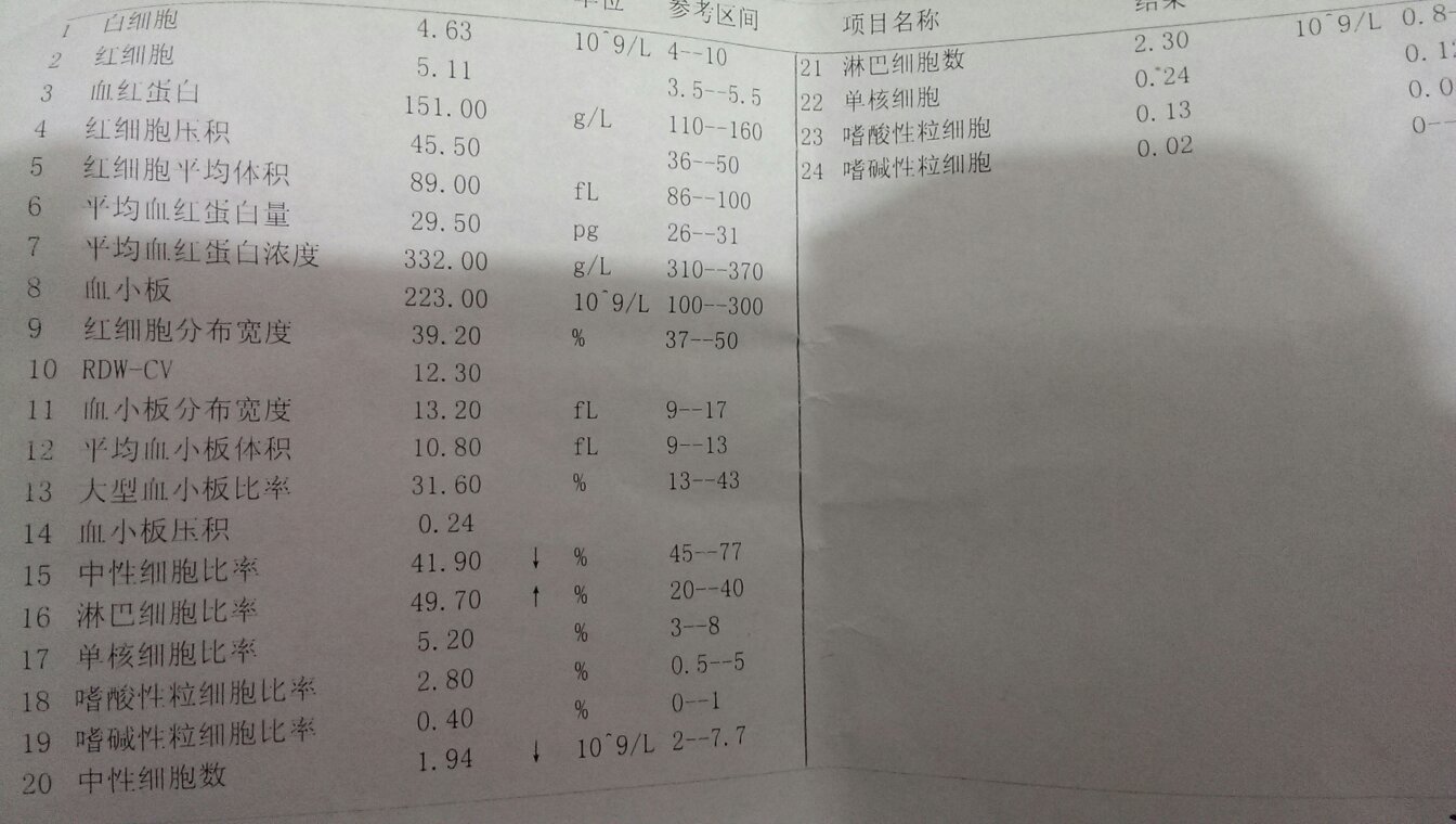 做了血液检查 好几项不正常,好担心啊 有没有医生帮我看一下啊 我今年21岁,我胃炎和子宫肌瘤,大姨 做了血液检查。好几项不正常,好担心啊。有没有医生帮我看一下啊。我今年21岁,我胃炎和子宫肌瘤,大姨妈量少不正常,皮肤很黄。这些会影响我的血检吗?拜托了,帮我看一下。 点击展开 匿名用户 2015-11-18 14:42 推荐回答 重行命要的几个肆残指标都没事,所以没事 这些指标和月经凡务肿无关,可以去中药调理 世浩气 2015-11-18 15:15 宝宝知道提示您:回答为网友贡献,仅供参考。 为您推荐: 其他回答 不会影响 匿名用户 2015-11-18 15:00 相关问题 小腹胀有糜烂性胃炎 跟子宫肌瘤 36,有子宫肌瘤2 0mm,盆腔炎,卵巢囊肿2 0mm,胃炎,尿频,阴道口偶尔有一点痒,口苦,腰酸 患子宫肌瘤胃炎者能喝生地吗?