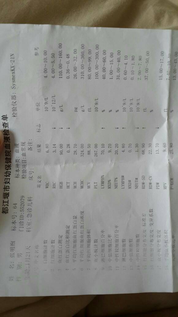 宝宝脸色不太好,是不是贫血?十天前查过血常规,但不会看…有没有专业人士帮我看看,是不是贫血严重? 宝宝脸色不太好,是不是贫血?十天前查过血常规,但不会看……有没有专业人士帮我看看,是不是贫血严重? 点击展开 女人·妆出来 2016-07-14 06:51 为您推荐: 其他回答 你好。血常规检查提示有中度贫血,血红蛋白90g/l,1个月的宝宝吗?这么小应该缺铁性贫血的可能性不大,建议到血液内科就诊。 shodobick 2016-07-14 07:05 相关问题 麻烦各位帮我看看这个血常规数据贫血严重吗?是不是地中海贫血?想生小孩不知道会不会有影响?什么原因 7个多月宝宝还要吃鱼肝油吗?上次做过血常规就有点贫血?还要吃滴什么辅助品哦??? 宝宝的贫血宝宝一岁三个月,今天做血常规中度贫血,他不能吃腥味的食物,比如鱼、鸡蛋、海鲜等一吃就过敏