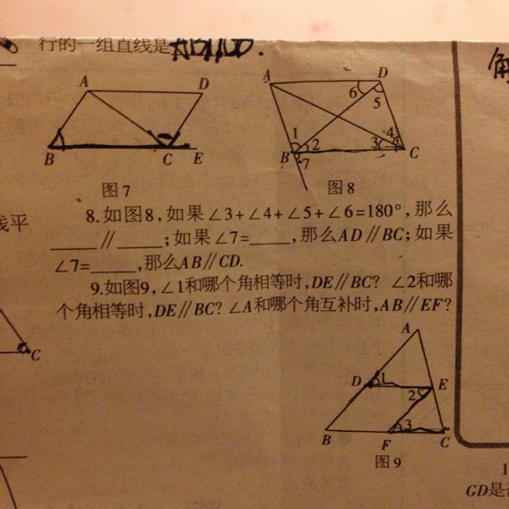 8、如果∠3+∠4+∠5+∠6=180°,那么BC∥AD;如果∠7 = ∠BAD,那么AD∥BC;如果∠7 = ∠3+∠4,那么AB∥CD. 9、∠1和∠B相等时,DE∥BC.∠2和∠3相等时,DE∥BC.∠A和∠AEF互补时,AB∥EF.