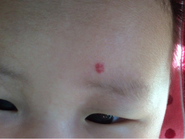 宝宝出生7-8天时眼眉上有一个红点 2个月确诊是血管瘤 到现在是四个月左右长了一些越有一厘米左右
