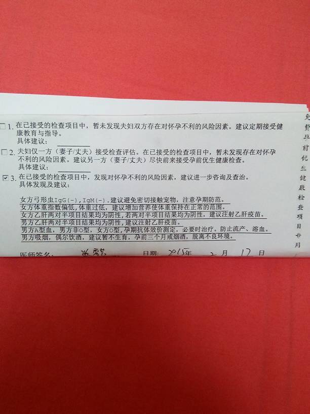 这是我们做的孕前优生检查结果 有没有什么问题啊 这是我们做的孕前优生检查结果 有没有什么问题啊 点击展开 凉情菇凉百毒不侵 2015-05-19 04:58 为您推荐: 其他回答 没有有效药物可以预防,因为是母子血型不合引起的。 爱狂风一样舞蹈 2015-05-19 17:48 孕前检查有一定问题,首先男方吸烟是影响怀孕的因素,需要戒烟,其次,要预防新生儿溶血,建议在当地医生指导下备孕。 爱狂风一样舞蹈 2015-05-19 11:02 相关问题 孕前优生检查结果帮忙看下正常吗? 很急,麻烦帮忙一下,我的孕前优生健康检查结果有一项是这么写的(女方巨细胞病毒《lgG》阳性,提示曾 孕前优生检查结果中促甲状腺激素偏高 34 47 低风险,这是什么意思?影响怀孕吗?