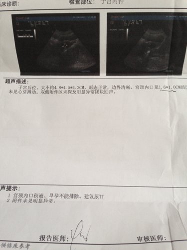 怀孕32天!早上白带咖啡色并伴有一点血色!害怕是宫外孕!去医院做了B超!第一次没检测出,后来憋尿!看到子宫内口有一个暗区!不能确定是孕囊!医生说如果是孕囊!也很危险!因为位置太低!有医生帮我看看吗?现在的心情好无助好难过!