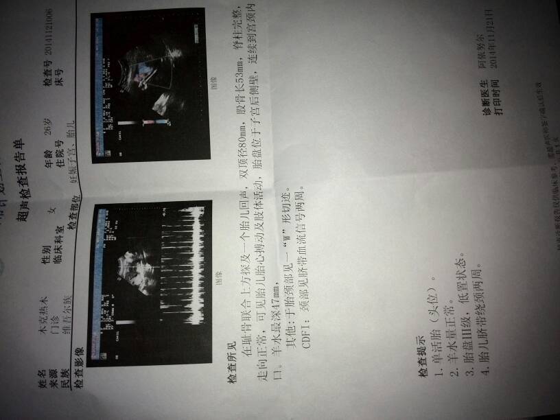 你好,你有胎盘低置的情况,这个在怀孕晚期是比较容易出现出血的情况的,还有就是脐带绕颈两周胎儿也容易缺氧,你可以考虑去医院检查下胎儿是否有问题