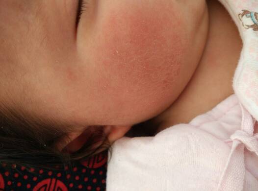 属于婴儿湿疹。按照中医讲多由于脾失健运、湿热内蕴、复感风邪、风热郁结肌肤而成。主要为变态反应性疾病。发病诱因是;消化不良、胃肠疾病、肠道寄生虫。首先保持卫生清洁、避免搔抓和挤压、避免外用肥皂水或热水洗、建议外用三黄洗剂或炉甘石洗剂、哺乳的母亲不宜食用辛辣食品及刺激性食品。
