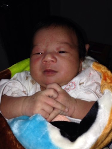 病情分析: 你好!你的情况多考虑是湿疹,妈妈注意调整饮食,要注意忌食辛辣刺激,避免进食易致敏的物品,如酒类,海鲜贝类食物应禁用,以清淡饮食为好;尽量减少外界不良刺激,如手抓,外用肥皂,热水烫洗等;衣着应较宽松,轻软,避穿毛制品或尼龙织品. 指导意见: 用湿疹锌软膏或尤卓尔或炉甘石洗剂擦患处试试