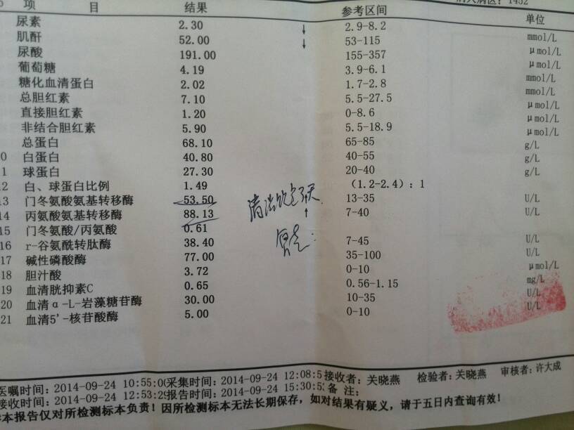 哪位宝妈会看验血报告呀?验血报告出来了,看不大懂,医生让复查好担心!! 哪位宝妈会看验血报告呀?验血报告出来了,看不大懂,医生让复查好担心!! 点击展开 妞ぃ縱嵤 2014-10-14 14:08 为您推荐: 其他回答 你好,建议你不要吃油腻的食物,也不要服用对肝不好的药物。 羽化翩跹lc 2014-10-18 18:35 你好,从你提供的化验单上看,你的肝功有点问题,建议你用点护肝药,7-10后复查看看。 羽化翩跹lc 2014-10-14 21:11 正常的,宝妈心放宽 メ Bicycle 2014-10-14 15:42 祝你好孕! 硪那麼小心ヽ還是丟了沵 2014-10-14 15:22 我的没问题 所以不知道你的 与子偕老_LlGa 2014-10-14 15:07 加载更多 相关问题 验血报告,医生说怀孕了,有人看的懂吗? 孕38周2天,昨天去医院检查又抽了6灌血,有宝妈也在这个时候验血的吗?医生说宝宝已经入盆了,大概多 怀孕12+1这是前天验血的报告单,有3项是低的,我看不懂是什么,想请专业医生给我解答,1:嗜酸性细