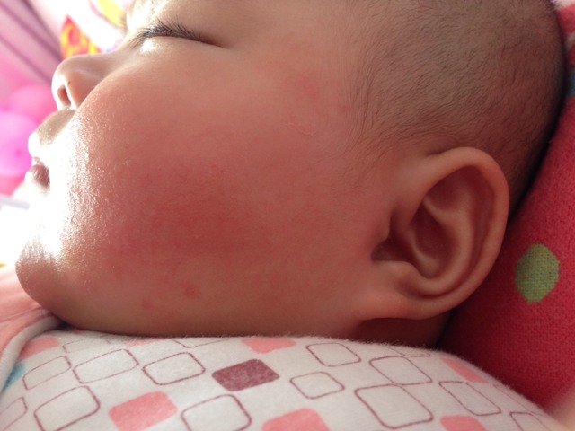 宝贝五个多月,带出去晒太阳把小脸晒伤了,脸红嘟嘟的,都好几天了,每天毛巾擦脸,抹点郁美净儿童霜和小