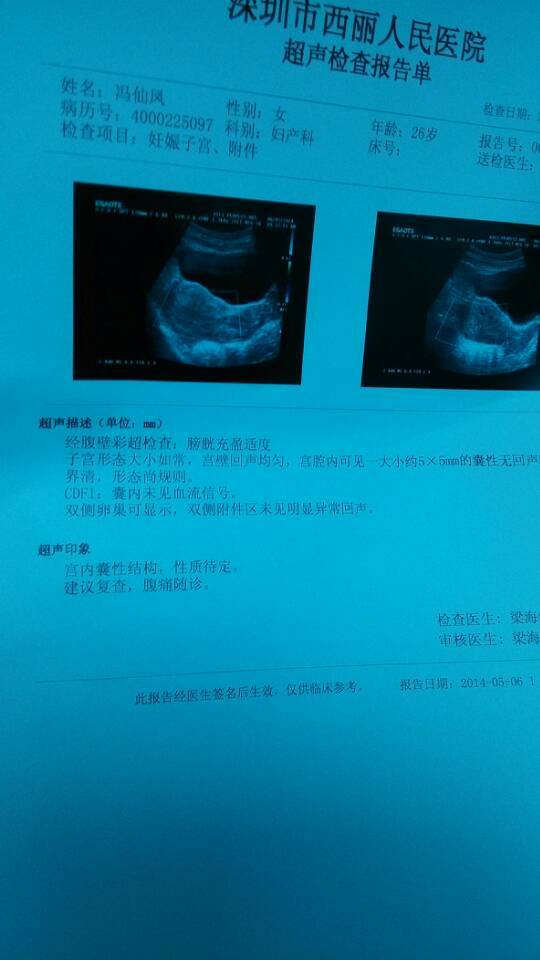 B超检查报告:子宫形态大小如常,宫壁回声均匀,宫腔内可见一大小5*5mm囊性无回声,边界清,形态尚