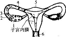 图示女性生殖系统剖面图.1是卵巢;2是卵细胞;3是受精卵;4是输卵管;5是子宫;6是孟剑祸阴道 (1)点荒受精的过程:精子进入阴道,缓缓通过子宫,在输卵管内与卵细胞相遇,精子与卵细胞结合形成受精卵.所以受精卵的形成部位在输卵管. (破查2)受精卵在经过输卵管进入子宫的过程中,不断地进行细胞分裂,形成胚泡,并且埋入子宫内膜.胚胎继续发育,其中的细胞开始分化成各种组织,由组织再形成各种器官、系统.逐渐发育成胚胎. (3)胎儿生活在子宫内半透明的液体--羊水中,通过胎盘从母体交换营养与废物.故答案为:(1)精子由阴道进入,通过子宫到达输卵管与卵细胞结合(2)分裂;分裂;分化(3)5;子宫;胎盘