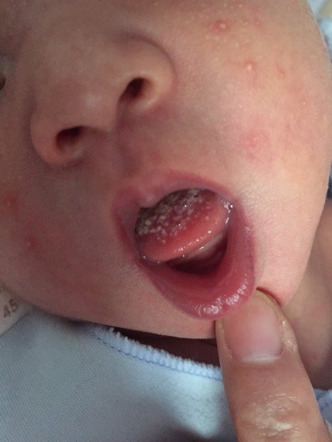 麻烦帮我看看这个是口疮吗 九天的新生儿,孩子舌头上白白的白点,一开始以为是舌苔重或者是奶瓣