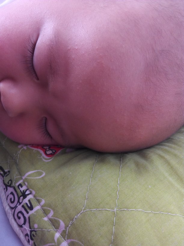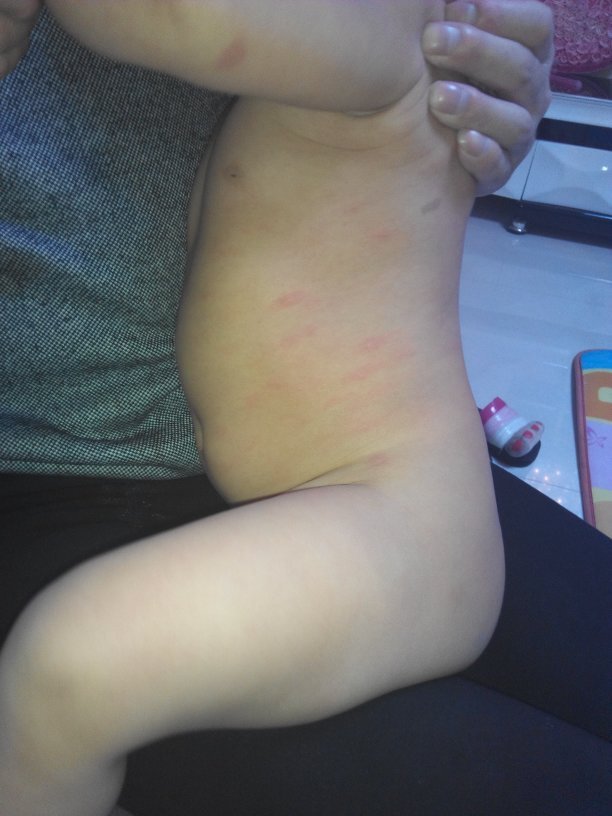 一周宝宝,今天发现身上长红疙瘩了,上面像是粉刺似的,有的大有的小,大的像蚊子盯的似的(如图),脑门