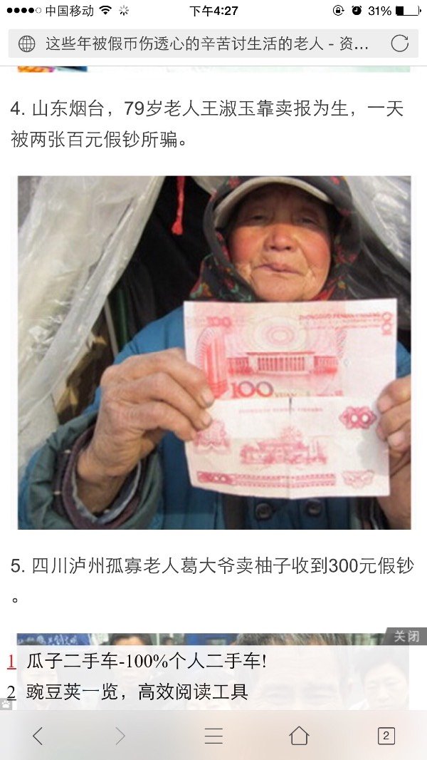 最近有个长图挺火的,里面有个拿着两张钱的老人,恕我好奇心过重,下面这张这什么国家的纸币? 点击展开 匿名用户 2015-11-19 16:32 推荐回答 下面这张是中国人民银行发行的点钞券! 匿名用户 2015-11-23 12:52 宝宝知道提示您:回答为网友贡献,仅供参考。 相关问题 有1000元纸币正面是一老人头像背面是俩小孩在学习是哪国币? 试图题(5分)(1)看图一回答:它是世界上最早的纸币叫什么?最早产生于什么时期(2分)(2)图二: 恕我好奇心强,为什么死人开始不会浮在水上,而后又浮上来?