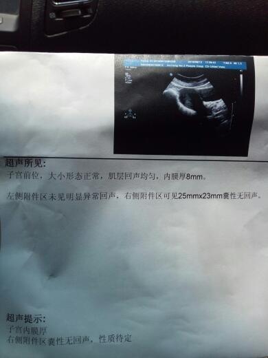 7月26号末次月经,今天做了彩超,说是看上去像囊肿,但是不确定,我想知道这个是卵泡还是囊肿,急 点击展开 匿名用户 2016-08-12 12:03 满意回答 你好,单从声像图上是很难确定的,建议定期复查之细,是可悼殖命以自己消失的以肿。 cn#BkkGGQBppp 2016-08-12 12:20 宝宝知道提示您:回答为网友贡献,仅供参考。 相关问题 彩超B超子宫里发现一个1 8X1 4CM的东西```12号来的月经````检查那天是31号`请问会是卵泡还是囊肿呢 三月十四开月经!一般都是五天左右!到今天怀孕几周了!我想知道准确答案 我是阴历十月二十七来的月经,最近恶心吐前几天彩超查是早孕,我想知道自己怀孕到现在应该是五十天了吧