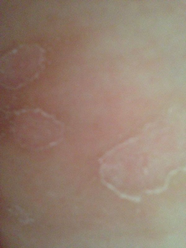 六个多月宝宝前几天发现肚子上长了一圈一圈的像是蜕皮一样,这两天又陆续增多了一圈圈的有一点红,今天发