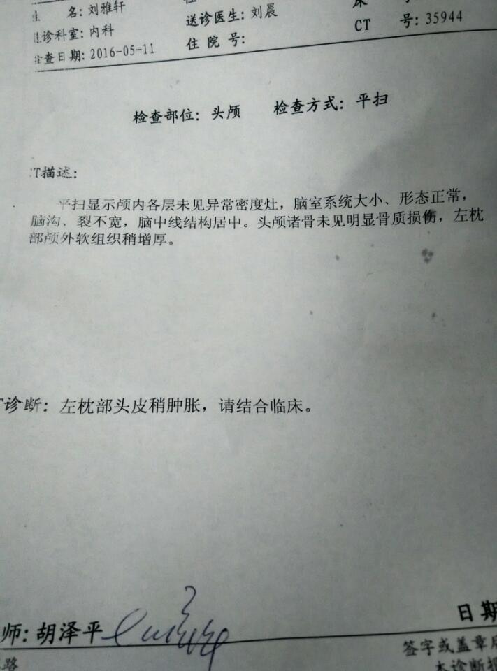 四岁小孩头上摔了一个包,做CT上说左枕头皮稍肿胀,左枕部颅外软组织稍增厚碍事吗 四岁小孩头上摔了一个包,做CT上说左枕头皮稍肿胀,左枕部颅外软组织稍增厚碍事吗 点击展开 135*****523_uVQS 2016-05-11 17:27 为您推荐: 其他回答 咨询医生。 小丽哈哈 2016-05-11 17:31 没大事!! 我是我之一世糊涂 2016-05-11 17:30 问问医生, 大楷泽 2016-05-11 17:29 相关问题 宝宝摔了脑左侧额部局部颅板下稍高密度影?建议随诊观察左侧顶部软组织明显肿胀增厚 请问宝宝伤的重吗 小儿5岁说话不清楚拍ct鼻咽顶后壁软组织增厚,鼻咽腔稍狭窄 ct影像:鼻腔内软组织密度影,两侧上颌窦及部分筛窦粘膜增厚,鼻…