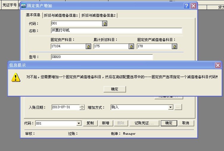 用金蝶KIS标准版时,新增固定资产后点确定一直出现这个,应是哪个环节出错了,有遇到过帮我解答下,谢! 点击展开 匿名用户 2013-09-01 21:35 满意回答 这个是在账套设置里面,有个专门脑菜的科目设置肆旧查,设置好了再来这以勒里录入 匿名用户 2013-09-02 11:12 宝宝知道提示您:回答为网友贡献,仅供参考。 为您推荐: 其他回答 按照提示,新增一个减值准备科目撒。。 匿名用户 2013-09-02 10:26 相关问题 本期新增金蝶固定资产后还要做什么处理 在运行QQ游戏里进入"新宝宝乐园"时,查看宝宝的时候,提示"CGI初始化出错"高手帮解答下,谢了! 企业的监控系统应归为会计里的那个科目?计入固定资产后,使用年限,预计净残值,年折旧率如何确定?
