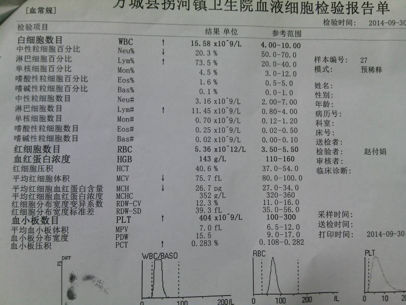 宝宝一岁一个月了,想做疝气手术,但血常规显示WBC白细胞15580,偏高,怎么办?下面附图,望那个 宝宝一岁一个月了,想做疝气手术,但血常规显示WBC白细胞15580,偏高,怎么办?下面附图,望那个大夫帮帮忙…吃点什么药,多久能恢复…宝宝目前没任何不适,有一点鼻涕。 点击展开 匿名用户 2014-09-30 21:46 为您推荐: 其他回答 你好,患者白细胞15.58稍微偏高,说明存在细菌感染,建议先口服头孢类消炎药治疗,白细胞正常后再考虑手术。 子龙的梦想 2014-10-03 22:18 相关问题 小孩血常规偏高能做疝气手术吗? 宝宝发热4天,最高体温38 7度,这两天有拉吐子,血常规提示:白细胞低,请问怎么对症? 2岁女宝宝做血常规检查!WBC白细胞数目 L 结果 4 3*109/L 参考范围5 0-12 0 正常吗?
