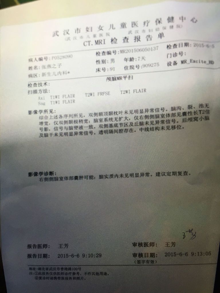 宝宝出生4天因黄疸和抖动送进新生儿科,后做脑磁共振说右侧侧脑室体部见囊性长T2信号影,信号与脑脊液