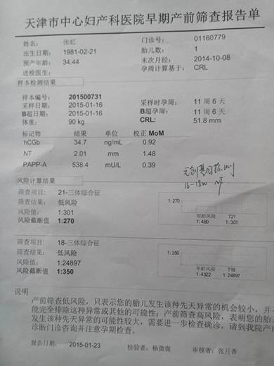 根据您提供的妊娠早期产前唐氏筛查的报告,目前各项检查值都使用低风险,说明胎儿发育异常存在的可能性很小,不必过于担心。平时要多休息,积极补充营养,注意孕期保健,定期产前体检,检查胎儿发育进展情况,祝您健康好孕1