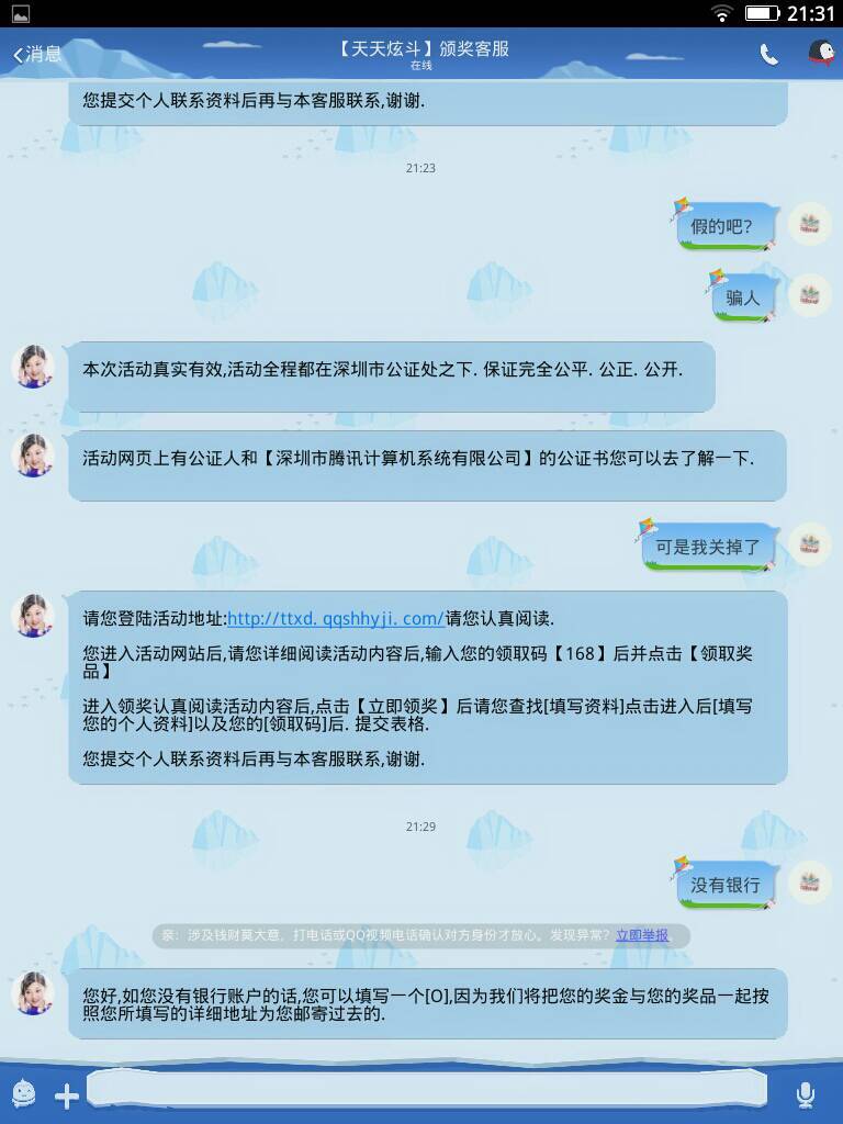 有一天,我玩天天炫斗,看到有什么奖叫我去拿 当时我很好奇就点了进去,里面叫我填完这些信息(有生分证 有一天,我玩天天炫斗,看到有什么奖叫我去拿。当时我很好奇就点了进去,里面叫我填完这些信息(有生分证,住址,电话……)填完之后说什么你不去交钱就要坐牢。。。。我很害怕,怎么办?是真的吗? 点击展开 匿名用户 2015-05-09 17:16 满意回答 骗子而已。 匿名用户 2015-05-09 17:18 宝宝知道提示您:回答为网友贡献,仅供参考。 为您推荐: 其他回答 不可能是真的 匿名用户 2015-05-09 17:29 我回答了你问题,要100块劳务费,不给的话就坐牢!你信吗? 母婴用户23031081 2015-05-09 17:28 假的 匿名用户 2015-05-09 17:26 骗子! 匿名用户 2015-05-09 17:25 加载更多 相关问题 我也收到同样的信息,一大早10086发来快男中奖信息,我很好奇的打开填好资料 填完发现如不交480 前几天收到一条爸爸去哪儿中奖信息然后我很好奇我就进了网址搞得像是真的一样填写后才发现我是不是被 老公晚上十点多了还和一个女人发信息,说是他朋友 我很好奇翻看她手机看了看,那个女的去海南旅游