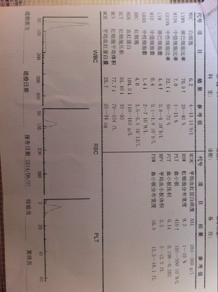 宝宝六个月验的血常规,请帮忙看下有什么问题 目前孩子精神很好,偶尔咳嗽几下,尿有时有点黄,混合喂养 。 点击展开 母婴用户511119792 2014-08-08 23:30 为您推荐: 其他回答 这个血常规的化验结果提示,白细胞总数没有升高,中性粒细胞比例明显下降,同时淋巴细胞比例和绝对计数均明显升高,且患儿近期有咳嗽病史,考虑病毒感染可能性大,不需要特殊治疗,患儿存在贫血,且平均红细胞体积缩小,考虑存在缺铁性贫血,需要补铁治疗 taokun830817 2014-08-09 09:16 相关问题 求帮忙宝宝闹肚子是吃羊奶粉了吗?屎尿常规正常,就是宝宝的血常规有点过高导致宝宝高烧,现在退烧了,就 宝宝五个多月,发烧三四天,打喷嚏,流鼻涕,有点咳嗽,去医院验了一个血常规,医生说是有炎症,拿的药有 生完孩子已经六天,由于奶水不够,所以混合喂养,但是发现宝宝小便每天两次,所以可以给宝宝喝白开水吗