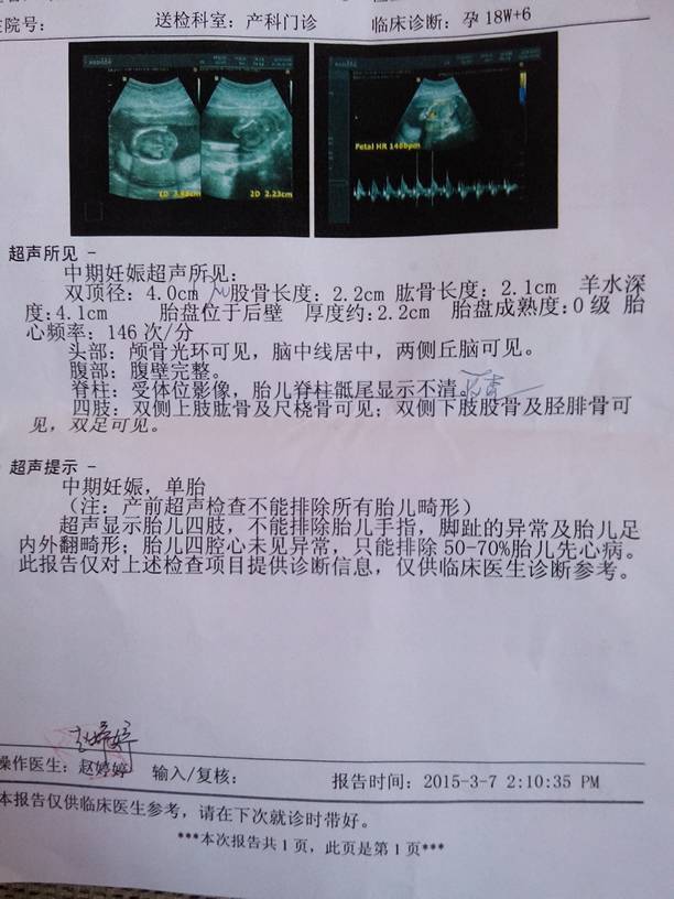 大家帮忙看看,这孩子的胎儿脊柱骶尾显示不清,大夫叫我明天复查,是不是孩子畸形的意思啊,这一晚上睡不 大家帮忙看看,这孩子的胎儿脊柱骶尾显示不清,大夫叫我明天复查,是不是孩子畸形的意思啊,这一晚上睡不好觉啊。 点击展开 祁宝宝♥驾到 2015-03-07 16:06 为您推荐: 其他回答 不会有事的,放心吧 尛丶楓孒__STGh 2015-03-08 19:10 会好起来的,宝妈放宽心 陈太太. 2015-03-07 21:33 宝宝像是男孩 幸福の終點站屬於你和我 2015-03-07 21:16 我建议你去让你的主治医生看下就知道了! 139*****031_4vlm 2015-03-07 19:18 孩子可能生病了 136*****926_845n 2015-03-07 18:07 加载更多 相关问题 大夫你好,我怀孕七个月了,今天去做彩超上面写着,抬头位耻上,脊柱因胎儿位置关系,骶尾 部显示欠清… 大夫您好,我怀孕33周,B超显示侧脑室增宽,但是没有脊柱裂