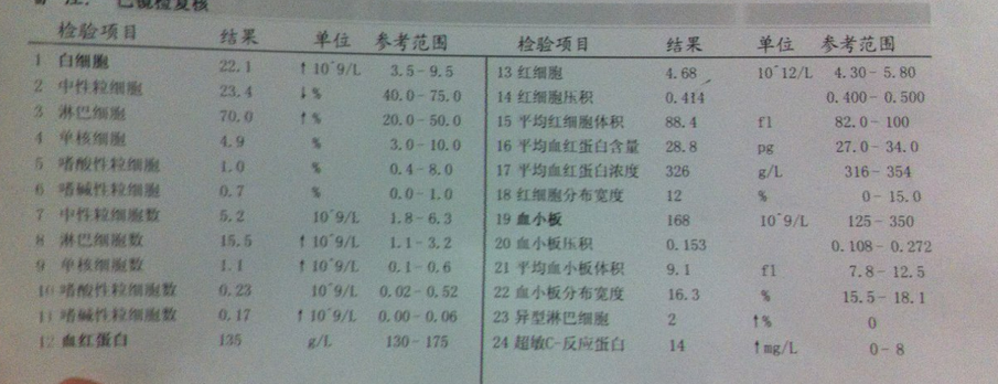 宝宝21个月,因为不肯吃饭、晚上哭闹去医院检查说是传染性单核细胞增多症,请专家帮忙看看化验结果,分 析化验结果,此病严重么?医生建议住院,查百度可能做骨穿,请问如果要求做可以拒绝么? 点击展开 匿名用户 2014-05-07 21:07 为您推荐: 其他回答 病情分析: 你好,由于婴幼儿的消化能力差,父母要针对孩子的年龄特点, 指导意见: 给孩子吃他能消化吸收并愿意接受的食品。可以给宝宝买点婴儿健脾散。 进访梦_Jtdf 2014-05-07 21:18 相关问题 宝宝传染性单核细胞增多症病愈后走累时会鼻塞是怎么回事,吃饭感觉也会,偶尔打喷嚏,用手抠鼻子,是鼻炎 生完宝宝例假一直有,64天了 去医院做了B超,上面说没事,可医生让化验血能吃饭了不? 宝宝今天第21天,从昨天晚上就开始哭闹,睡觉很少怎么办呢?要不要带宝宝去检查