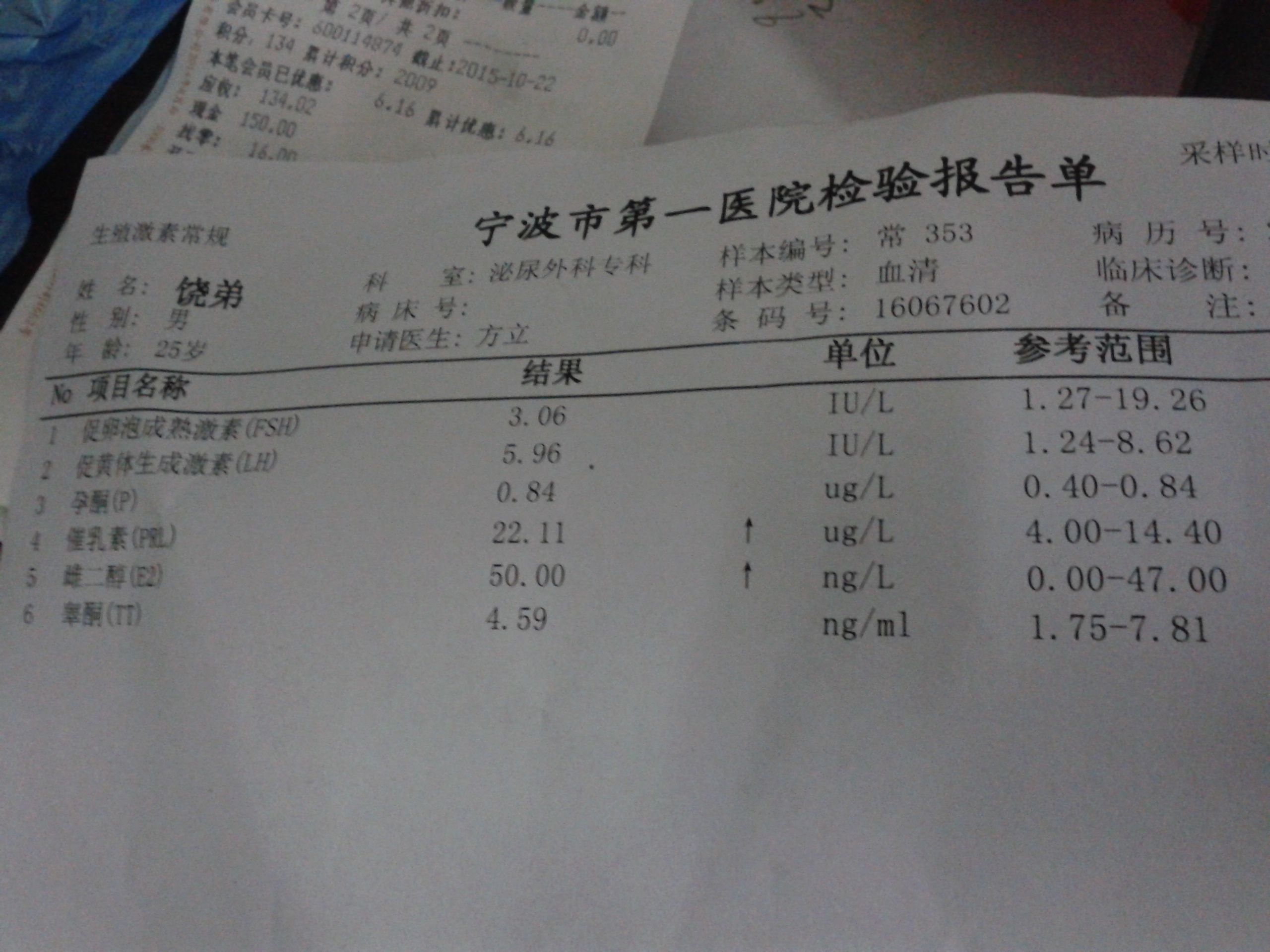 哪位专家帮我看下这男性激素六项检查报告,催乳素和雌二醇偏高了是什么情况 精子也检查过,质量很好 点击展开 匿名用户 2014-12-28 19:26 为您推荐: 其他回答 催乳素和雌激素偏高,你注意一下你的乳腺是否有硬结,或者增大。若是有就要尽早治疗。 cn#BBaBVLGLpQ 2015-01-01 02:01 相关问题 性激素六项检查雌二醇偏低,可以促排吗 本人检查精子质量报告如图,上面有项说液化时间60分钟(不液化),需要治疗吗?要治的话吃什么药好? 本人29岁,今天刚做了精子质量检测,但不懂上面参数,请问医生我的精子检测报告正常吗?准备要宝宝,需