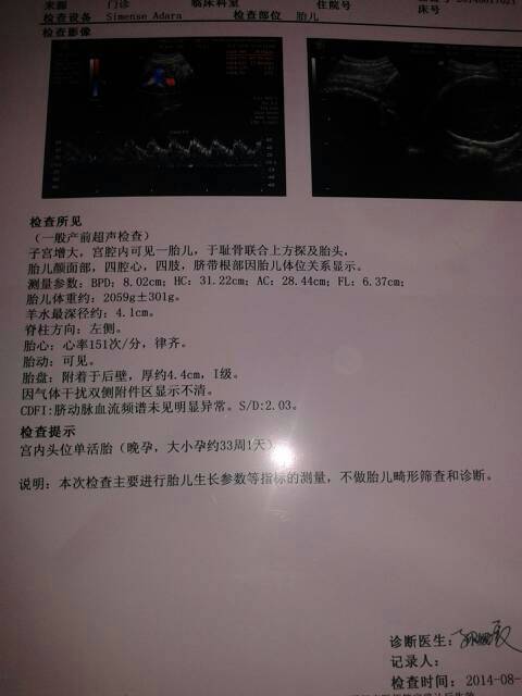 根据超声检查数据,你的宝宝发育的正常。孕33周的时候双顶径(BPD)范围值为80.6~8.93cm,头围(HC)范围值为28~33.6cm,腹围(AC)范围值为2.53~3.29,股骨长(FL)范围值为5.5~7.3,您的宝宝的测量参数大都属于范围内,说明宝宝发育的还可以。