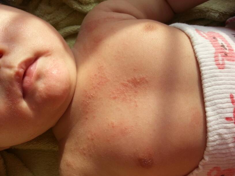 宝宝快4个月,胸口起红嘎哒,一块一块的摸上去很糙糙的感觉,感觉还特干,脱皮很厉害!原来问过说是湿疹