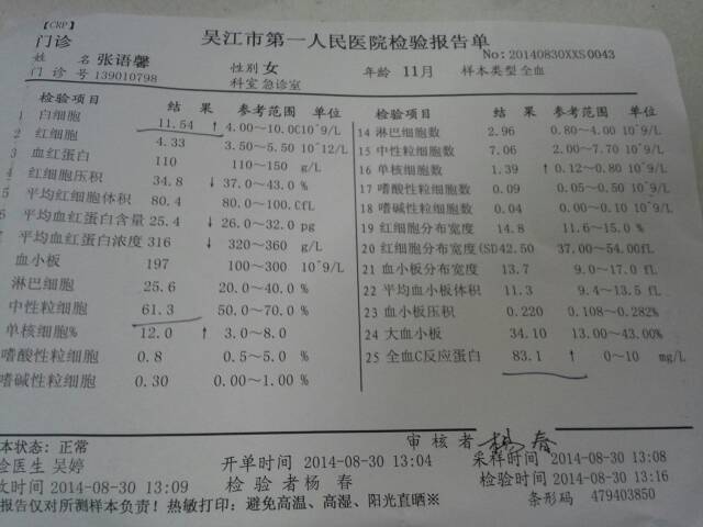 有哪个专业的医生帮我看看这张化验单到底哪里有炎症?今天我家宝宝高烧42度 急急 有哪个专业的医生帮我看看这张化验单到底哪里有炎症?今天我家宝宝高烧42度。急急 点击展开 指尖の温柔 2014-08-30 20:17 为您推荐: 其他回答 这张是你宝宝血常规的检查,白细胞增高和全血C反应蛋白增高只能说宝宝有炎症感染,而中性粒细胞增高只能说是细菌感染,并不能看出是哪里的炎症。 受受诱惑fly 2014-08-30 20:21 相关问题 宝宝反复高烧,刚刚又到39度了 有谁看的懂化验单?帮我看看 怀孕37天发高烧2天了,温度38到39,还去妇幼保健院了,医生给我挂液怎么退不下来 对宝宝会有影响 今天上午发高烧下午去医院打点滴,我宝宝刚满15天一直母乳,因为高烧不退医生给我打吊瓶,不能喂母乳了