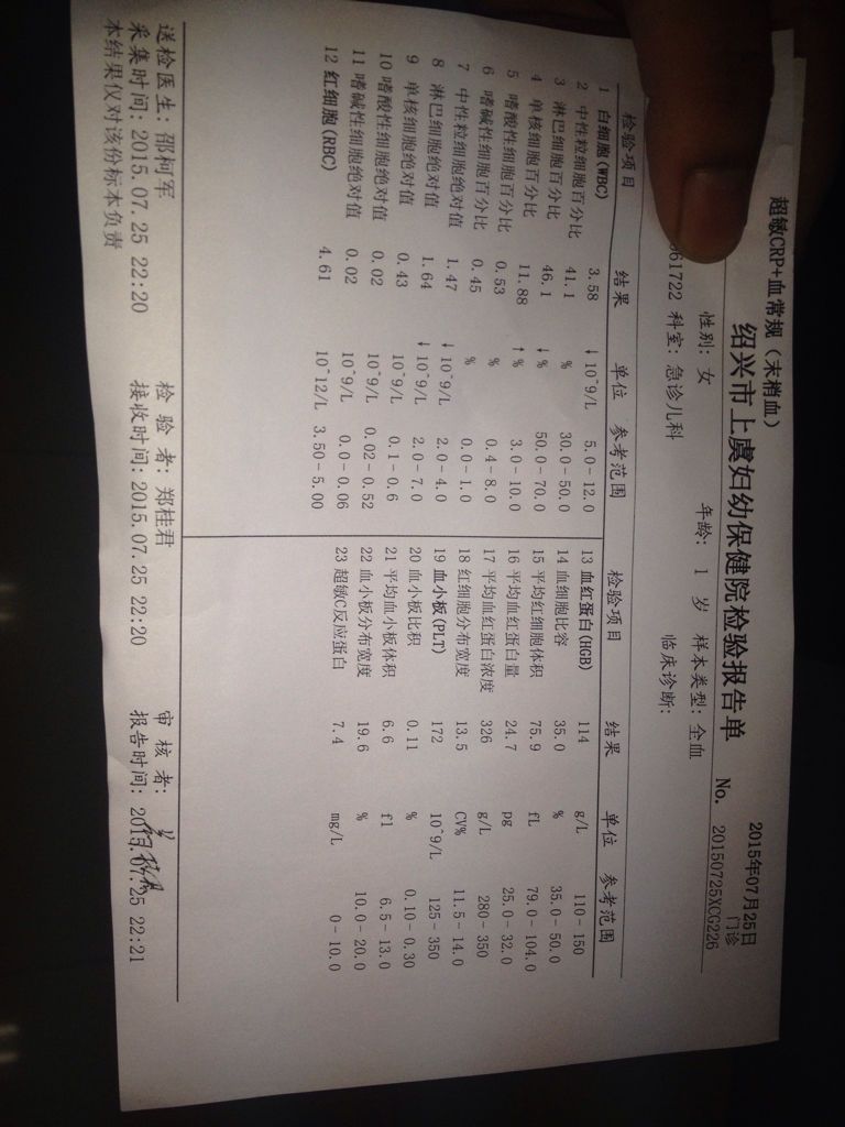 这张化验单说明了什么问题?小孩体温已经达到39℃ 点击展开 yangwenshan01 2015-07-26 01:16 满意回答 你好!c反应蛋岩菜铜白正常,白细胞降低考虑是病毒性感染引起的发烧可能性大,这种情况下发烧容易反复,建议可以服用抗病毒药如利巴韦林颗粒,多喝水,如果一直反复高查它烧的话,要考虑挂瓶治乡瓦疗。 renring127 2015-07-26 02:02 宝宝知道提示您:回答为网友贡献,仅供参考。 相关问题 宝宝发烧带宝宝去医院检查血化验检查了口腔都都没问题 医生开了药吃了 但体温一直都是38-39度 希望有谁能解释一下这两张化验单什么意思 小孩三个月了,体温36 9,拉肚子5天了,母乳喂养 我小孩体温一直在38度至39度,还咳嗽,吃退消药和挂消炎药水四天了还没见好!血规测过没问题 请问!哪…
