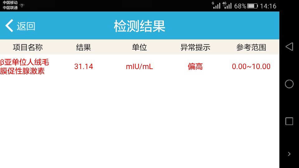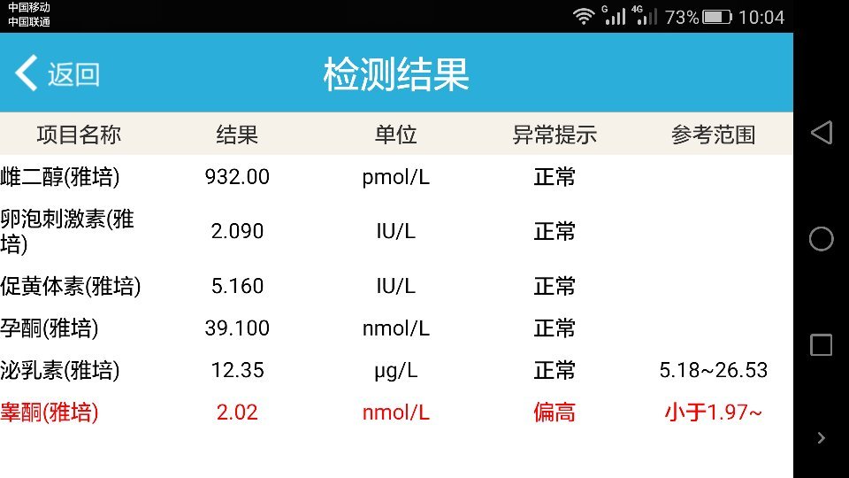 两次尿检阴性,然后HCG检查值比较高,性激素检查睾酮值偏高,是怀孕吗? 点击展开 匿名用户 2015-11-30 10:17 满意回答 绒毛膜促性腺激素值增高,说明是怀孕了,需要隔天监肆医基测绒毛膜促性腺激素值的增长翻倍过纺情况。脑乡 cn#BVVkLpuGGL 2015-11-30 10:21 宝宝知道提示您:回答为网友贡献,仅供参考。 相关问题 本人结婚三年并未怀孕!期间去过惠山人民医院检查!照过B超、验过血、说是睾酮偏高、还有 尿检、白 我是10月20号同房的,11月15号去医院检查,尿检和血检HCG值都显示怀孕了,但是B超去看不到孕囊,请问这… 身高163 体重84公斤 性激素检查中睾酮高 一直在吃达英35 这个月月经推迟12天又来了