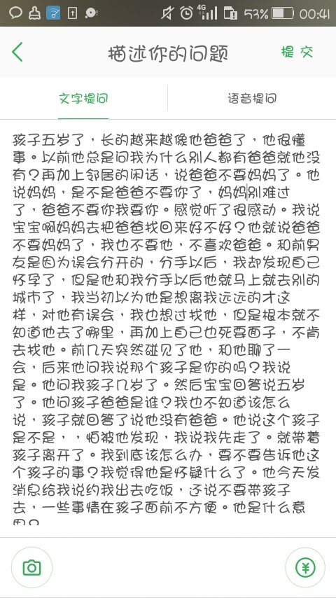 你和他有聊了一会,我也不清楚你了解到了什么,所以我分开讲了。1:如果他已经有家庭了,那么你就不要去了,坐尺因为这么多年你都过去了,错误已经造成了,没必要再为了孩子再去动荡另一个家庭。2:如果他还没有家庭,那么你应该去,告诉他你和孩子的全部事实,然后看他这么回应你再决定下一步。3:我有点难以判断你现在是不是已经有了新的家径抗庭了,如果有的话,那就不要去了,道理和1一样。如果依然单身,那么除了2的做法外,你还可以有另外一种做法,那就是你去了后,他应该会先提孩子的,(反正等他先提),你可以先反问他为什么要件减宝问孩子的事,如果他只是回答说是从孩子的回答中感到奇怪的话,那你可以反问他是不是以为这孩子是他的,看他回答后在看情况是不是接着问如果是他的他会怎么办,接下来就看你自己的了。你是个倔强的女人,另外的做法或许可以解开你的心结,但如何把握也只能靠你自己了。