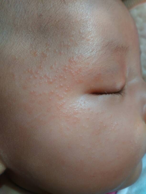 一个别热到了,如果吃母乳,妈妈应该少吃一些刺激的食物。可以用金银花煮水给宝宝洗脸。别用带松字的药膏里面有激素。