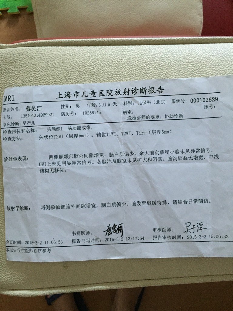 宝宝早产2个月,现在21个月还不会自己走路 做过放射学检查:诊断两侧额颞部脑外间隙增宽,脑白质偏少 宝宝早产2个月,现在21个月还不会自己走路。做过放射学检查:诊断两侧额颞部脑外间隙增宽,脑白质偏少。脑发育迟缓待排。 点击展开 苏小丽1 2016-08-01 13:10 为您推荐: 其他回答 祝宝宝健康,, 精彩人生,只因有你 2016-08-01 13:37 祝宝宝健康 幸福々宝妈 2016-08-01 13:21 你好,这个考虑可能存在脑积水,估计有脑瘫 xuehuo123456 2016-08-01 13:11 相关问题 出生37天,30加2早产,两侧大脑半球对称 右侧顶叶脑白质区见斑片状短t1信号 考虑脑损伤,会不会 婴儿打神经和赖氨酸晚上哭闹怎么回事我有双胞胎女儿早产一个月,医院CT脑白质密度低,打神经节苷脂和赖 早产儿磁共振平扫脑白质信号不均是什么意思