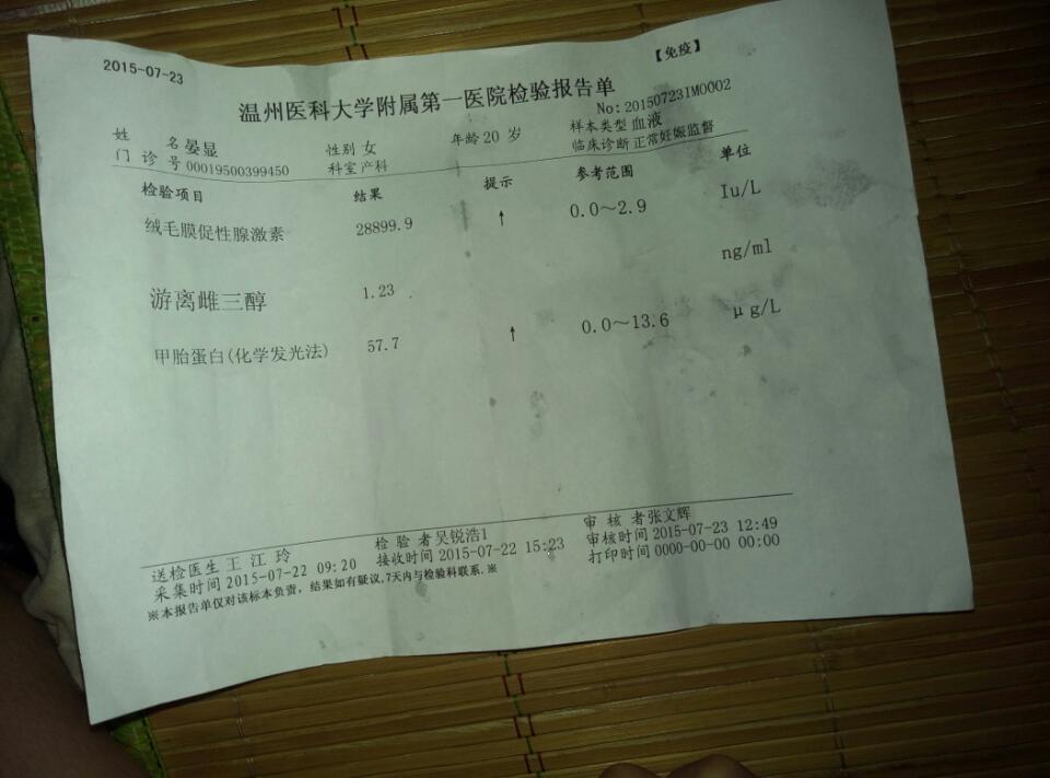 有医生在吗?能帮我看看我唐氏筛查的结果吗?今天没有预约到医生,心里有点担心,拜托了 有医生在吗?能帮我看看我唐氏筛查的结果吗?今天没有预约到医生,心里有点担心,拜托了 点击展开 晏娴 2015-08-08 20:38 为您推荐: 其他回答 我的一个箭头都没有 匿名用户 2015-08-09 10:26 是啊,我们检查的上边标的低风险 158*****159_SEkS 2015-08-09 09:18 你这应该是糖筛而不是唐筛哦 鱼儿宝 2015-08-09 07:08 箭头向上就偏高 匿名用户 2015-08-08 23:51 医院没打电话应该都是正常的吧,我都没去拿结果 胡古月 2015-08-08 23:43 加载更多 相关问题 已经21周了,今天到医院预约四维,医生说我没做唐氏筛查,现在已经过了那个时候了,心里好担心 今天做检查,B超的上面有个附注,其中一天是估测胎儿染色体风险异常,问医生,医生说没事,但就是心里很 今天去查四维了 各项都正常 看到心脏时B超医生说了一句跟其他胎儿的不一样心里很紧张 明天