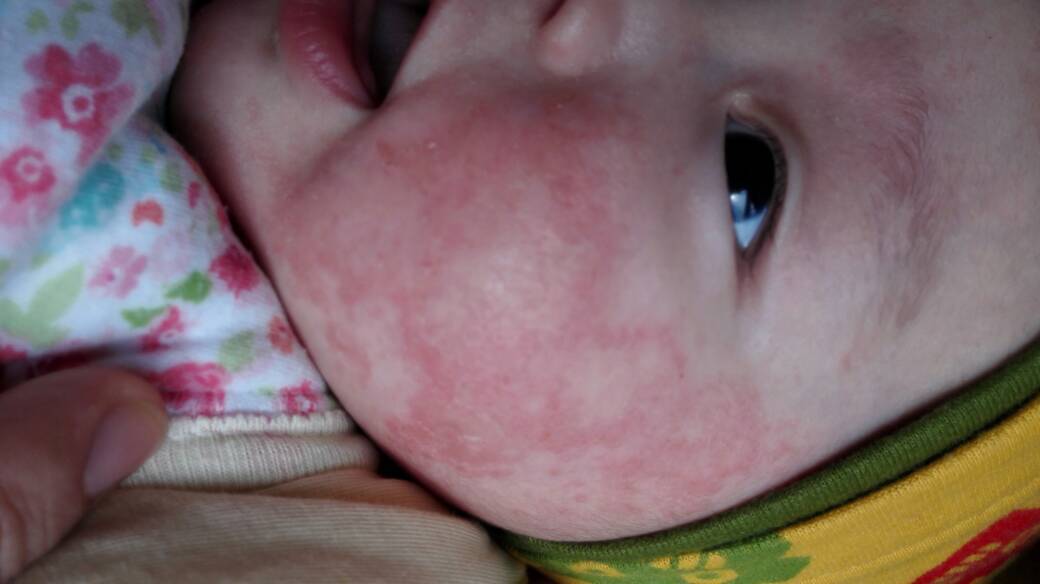 三个月的宝宝,脸上红红一片,还大片脱皮,这是湿疹还是过敏