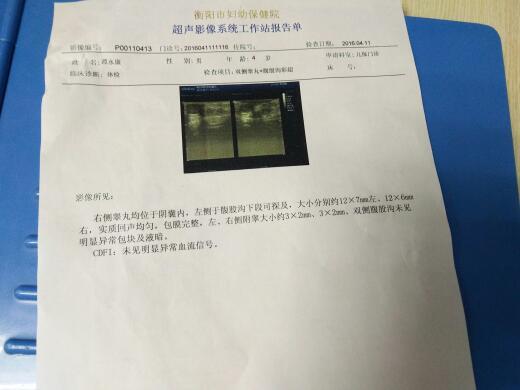 本人儿子四岁了,是个早产儿,在医院的时候一切正常,在一岁左右的时候我们发现他只有一个睾丸,他快三岁的时候在我们自己那个镇上做了手术拉下来了,但是就在前几天我感觉他那个睾丸好像跑到一边去了,就带他去妇幼看,那里的医生说还是在两边的建议做了四维看下,结果出来了就是说睾丸发育不良,一个医生就说要打针吃药,(打的针是激素)这是一个年老的医生说的,然后另外一个年轻的医生就建议说补锌,最少的补半年都不知道还有没有效果!后面我又带他去附一看了,也是个年老的医生,他说多吃那种没打鸣的公鸡就可以了!看了三个医生给了不同的答应,现在我都懵了,本来自己什么都不懂!希望这里面有懂这方面的人给我解答一下,先在这里谢谢了。下面我附上我儿子的b超图纸跟小朋友年龄段的睾丸大小的正常值!