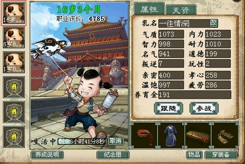 神结局! 要求气质,内力,智力,耐力,名气都≥999。 现在年龄差不多了,建议你先把装备换掉,以道德和叛逆(这两项能增加评价)为主的。 换好装备之后,如果有哪项不够999的就把他全部弄到≥999,如果年龄还有时间就弄叛逆和道德。 现在基本就是完成了,不换装备的话就专攻名气就行。