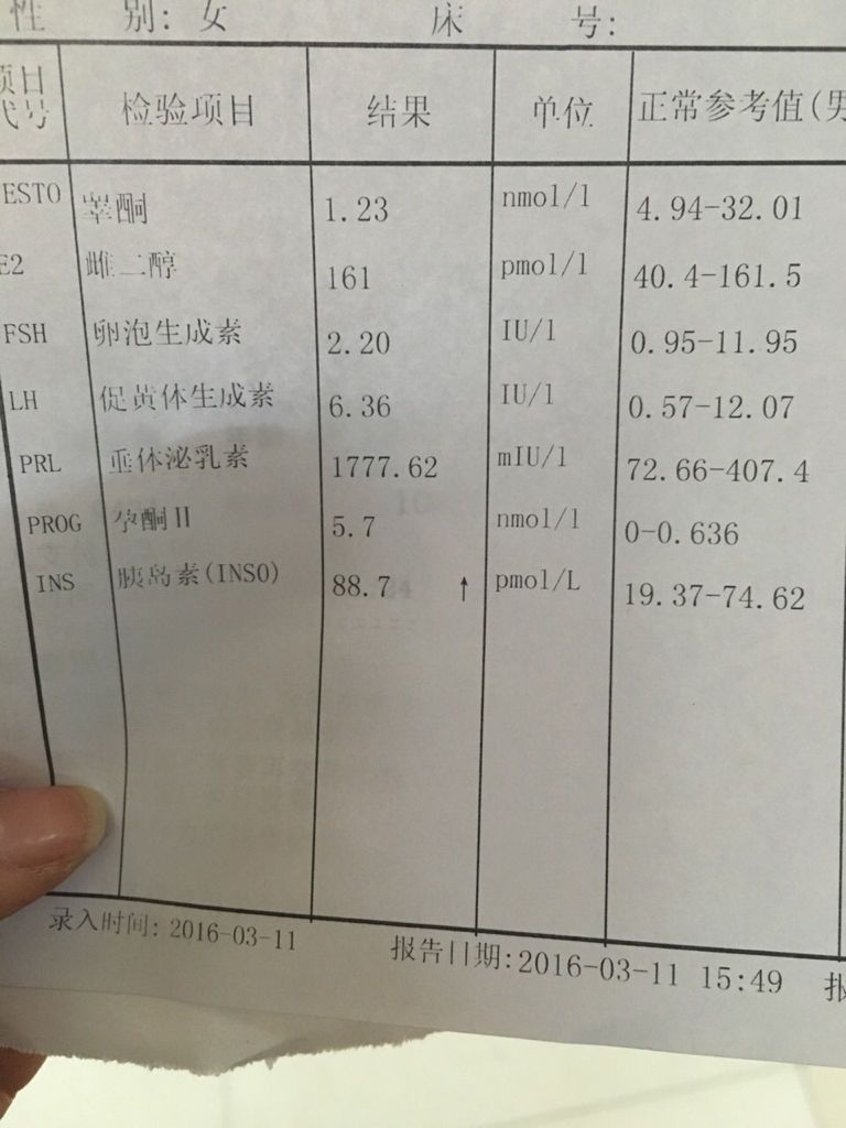 月经快两个月没有来了,去医院查了性激素六项 垂体泌乳素好高 医生说不确定现在我有没有怀孕让我先吃黄 月经快两个月没有来了,去医院查了性激素六项。垂体泌乳素好高。医生说不确定现在我有没有怀孕让我先吃黄体酮促一次月经,月经走后再去查一下 如果还偏高就做核磁共振看看 因为这个值太高了…… 听完都吓哭了 有没有懂的大神帮我看看啊 点击展开 匿名用户 2016-03-11 17:53 为您推荐: 其他回答 暂时不要担心什么,会有办法的! 匿名用户 2016-03-11 18:01 有好几项不正常呀 匿名用户 2016-03-11 17:57 相关问题 检查性激素六项:垂体泌乳素偏高 吃了中药后检查正常… 月经第二天去检查性激素六项,结果垂体泌乳素显示73 09,会不会怎么样?对以后怀孕有影响吗? 月经量少,月经第二天做性激素六项结果垂体泌乳素22 25ng/m1是高还是低,大夫让我做B超,我月