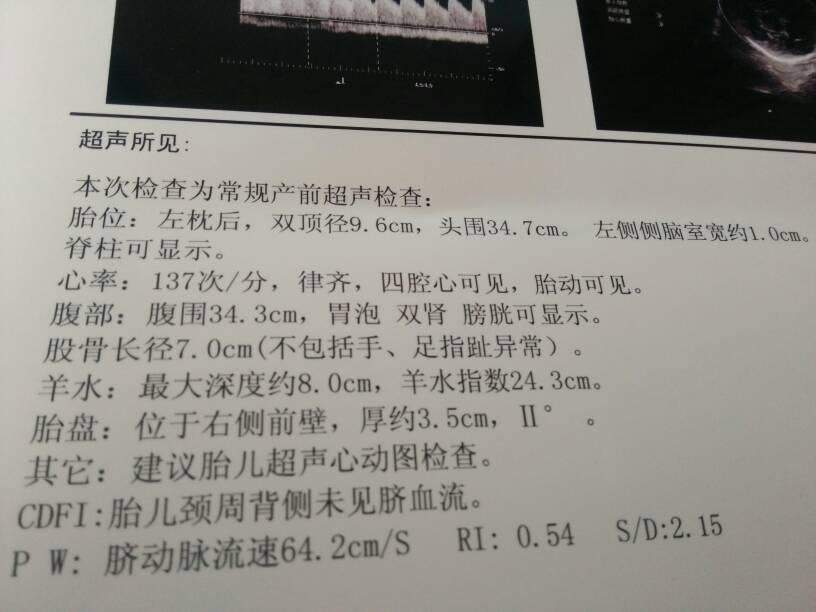 符合39周吗双顶径9,6头围34,7左侧侧脑室1,0心率137腹围34,3股骨长7,0羊水深度8 符合39周吗双顶径9,6头围34,7左侧侧脑室1,0心率137腹围34,3股骨长7,0羊水深度8,0指数24,3胎盘位于右侧前壁厚约3,5二级能顺产吗 点击展开 匿名用户 2016-04-15 12:45 为您推荐: 其他回答 问你的主治医生,除了胎儿的情况,还要考虑你自身的条件的 紫夜默默 2016-04-15 13:00 相关问题 怀孕39周加6天宝宝双顶径9 6,头围33 4,腹围31,股骨长7 1,羊水深度5 9,胎儿心率每 33周双顶径,头围,腹围,股骨长,羊水深度,心率等正常值是多少 胎儿现在15周,b超结果,双顶径2 9cm,头围11cm,腹围9 2cm,股骨长1 8cm 羊水深度4cm,心率156次每分 这…