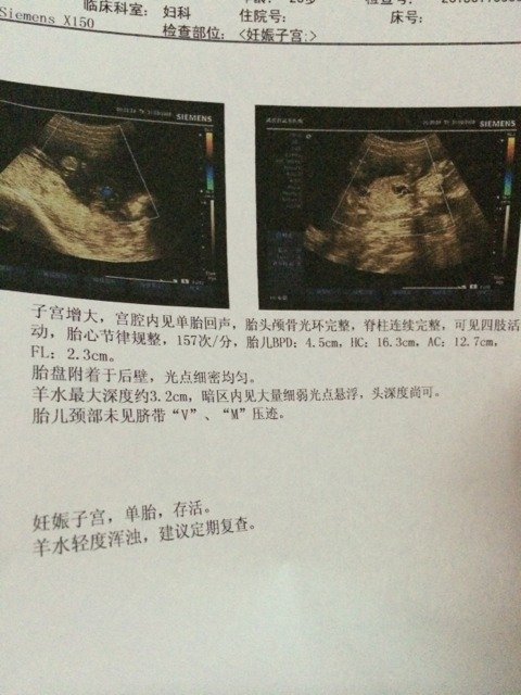 怀孕17周5天,检查所指,子宫增大宫腔内见单胎回声,胎头颅骨光环完整,可见四肢活动,胎心规则,15