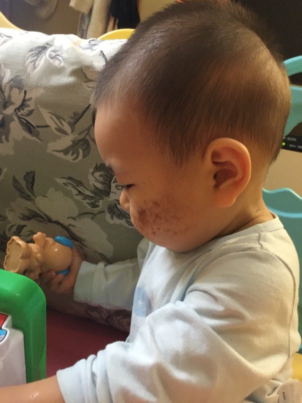 宝宝十个月脸上有太田痣 24号下午做的激光治疗 治疗后让摸两种药抹一周 等结痂并且痂掉了后再抹一种祛疤防晒的药 图片上是治疗后第二天的样子 脸上是结痂了吗?还是只是涂抹的胶状的药膏干了才这样?治疗后多久可以沾水洗脸洗澡?