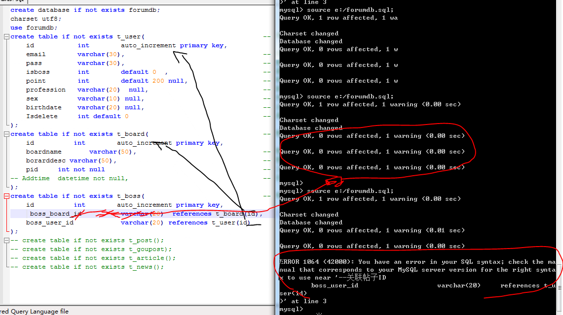 sql 一个t_boss表关联了t_boardID就会报错,我把 ( boss_board_id varchar(20) references t_board(id),)这句删了只关联user的id就不会报错。详细看图片,好奇怪的一个错啊