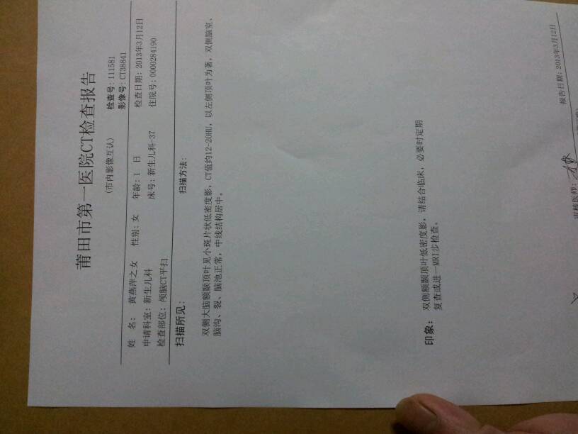 新生儿昨天CT报告!请大神帮忙解读下!医生很忙 点击展开 匿名用户 2013-03-12 09:18 满意回答 报告是么有什么布缘件问遮渐题的惑瓦,如果真的有问题,医生再忙也会说的,没有什么问题他才不说的 匿名用户 2013-03-12 09:50 宝宝知道提示您:回答为网友贡献,仅供参考。 为您推荐: 其他回答 去问问别的医生吧,又不是只有他自己会看! 匿名用户 2013-03-12 10:03 相关问题 那位医生可以给看看脑CT报告 新生儿!!急!!!!! 我昨天一个小医院做四维20分钟,今天拿报告,医生看一眼就说没事,也没有图,只有文字,会不会太随便看 你好,我昨天在医院验血,报告上写着确认妊娠,可是医生说没有怀孕